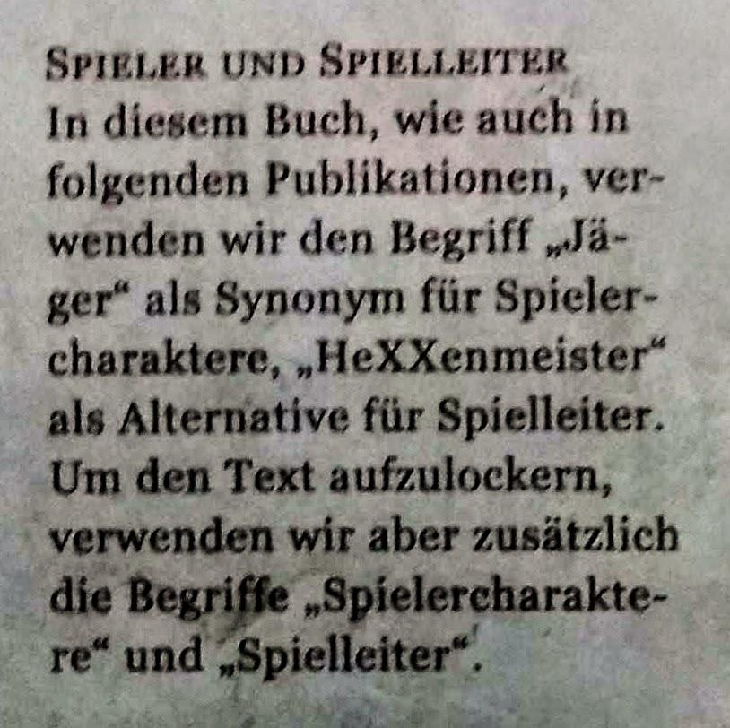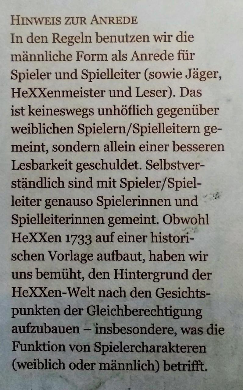 In Hinblick auf den Anspruch, bessere Lesbarkeit anzustreben, empfinde ich das als schlampig. Immerhin ließe sich das leicht in einer zukünftigen Auflage korrigieren, indem jedes Vorkommen von entweder "Spielleiter" oder "HeXXenmeister" erstmal durch das jeweils andere ersetzt wird. Eine inklusivere Sprache dürfte ein deutlich größeres Unterfangen sein.