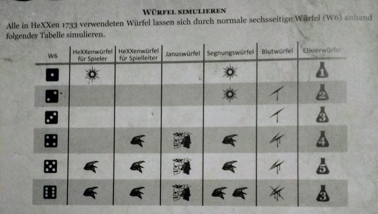 Eine Substitution durch reguläre W6 wird zwar durch die Tabelle nahegelegt, ich kann mir aber nicht vorstellen, dass damit eine schnelle Auswertung der Würfelergebnisse möglich ist. Ich gehe davon aus, dass während der Spieltestphase die Spielrunde mit normalen W6 gespielt hat. Im Zuge dessen werden sie wohl erkannt haben, dass angepasste W6 nicht nur besser aussehen (den Punkt gestehe ich gerne ein), sondern auch die Würfelauswertung beschleunigt. Da es an vielen Punkten im Regelwerk heißt "würfele [Januswürfel, Segnungswürfel, Blutwürfel, Elixierwürfel] mit" kann auch nicht einfach die Würfelzahl erhöht werden, sondern sie müssen ja optisch unterscheidbar bleiben.
